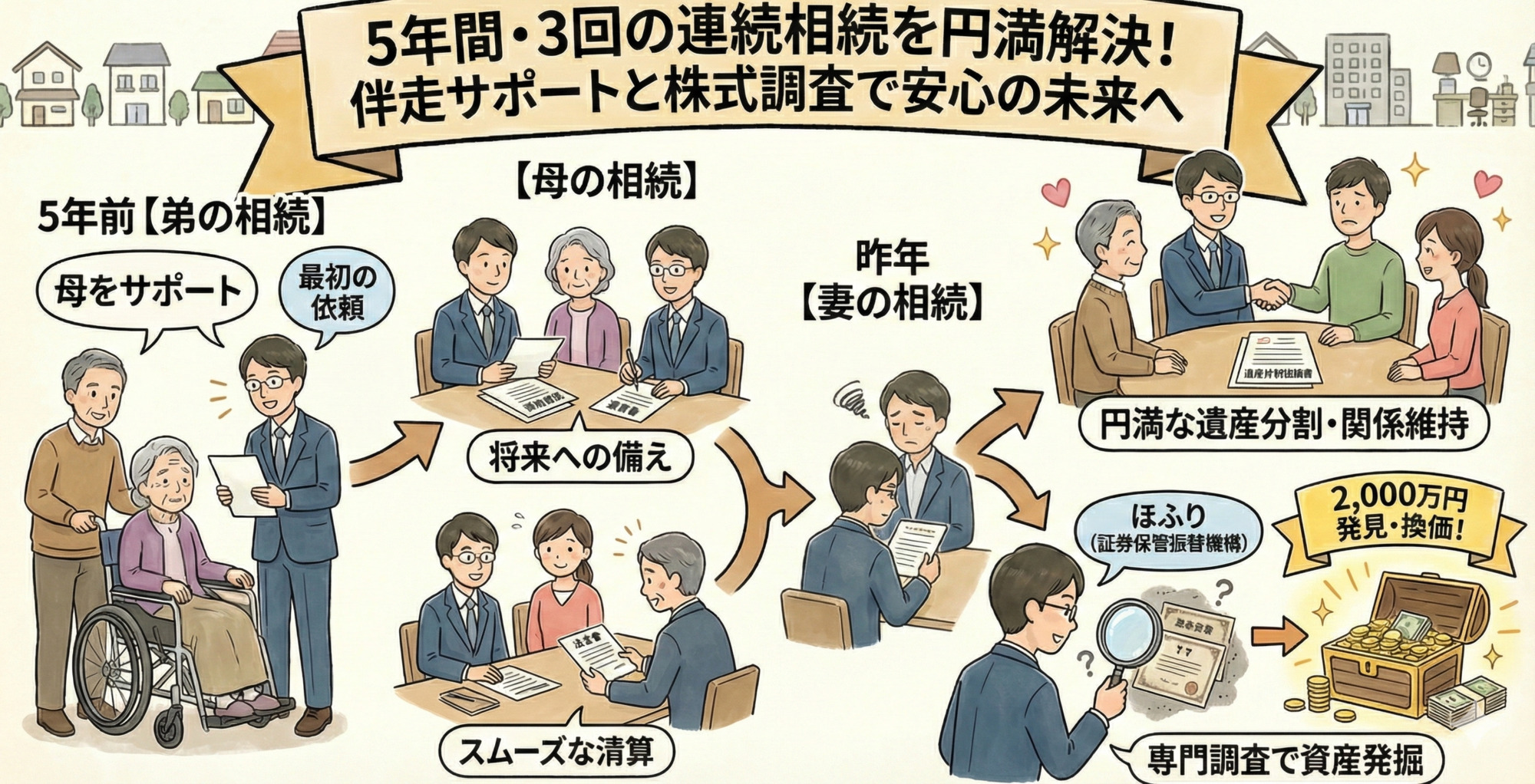 度重なるご家族の相続(弟・母・妻)に寄り添い、法務と精神面の両方から円満相続を支え抜いた事例